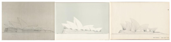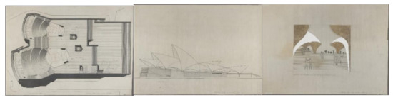 Design evolution. From left to right elevations drawing from 1956 (Brown Book, competition proposal), 1958 (Red Book, elliptical geometry), and 1962 (Yellow Book, spherical geometry) (www.records.nsw.gov.au; last accessed 2 December 2021) [21].