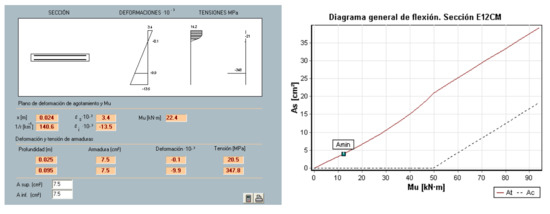 General bending diagram of a 12 cm thick reinforced concrete sheet. Prontuario Informático IECA (top). Interaction diagram axial-bending moment of a 12 cm thick reinforced concrete shell. Prontuario Informático IECA (bottom).