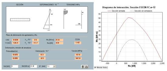 The bending moment capacity of the 12 cm thick concrete shell has been calculated approximately in order to compare it with the bending moments obtained from the calculation model developed. The estimated ultimate bending moment is Mu = 22.4 kNm (Figure 13, top). If we consider the concomitant action of this bending moment with an axial force, either tensile or compressive, we will be in a scenario much closer to the real one in the structure to be analyzed (Figure 13, bottom).