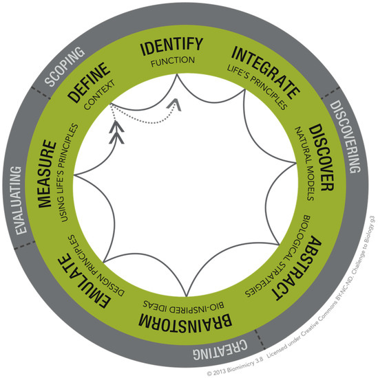 - Rowland, R. Biomimicry Step-by-Step. Bioinspired Biomim. Nanobiomater. 2017, 6, 102–112. [Google Scholar] [CrossRef]