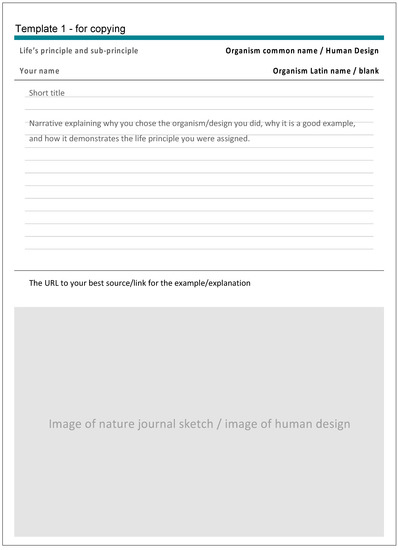 The students were introduced to a general overview of the six main LPs and then assigned LP related readings [17] and handouts (Figure 2a,b) by the authors. Students were then assigned to teams of 2–4 depending on class size. Each student was assigned 1–2 sub-LPs to research. A link to the Exploring Life’s Principles in Nature and Design assignment template Google Slides (Figure 3), was shared with all students. The template slides included: