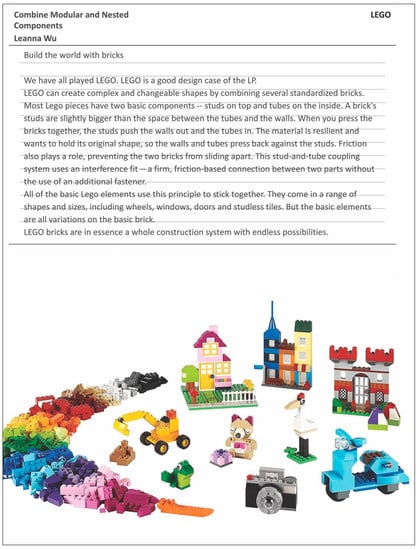 Example slide of LP in design ASU. Available online: https://entertainment.howstuffworks.com/lego.htm; https://www.amazon.com/LEGO-Classic-Largr-Creative-Brick/dp/B00NHQF6MG (accessed on 26 January 2022).