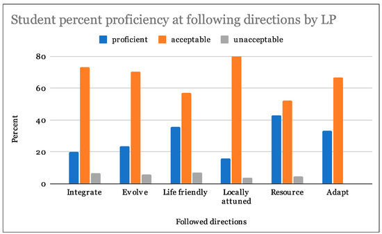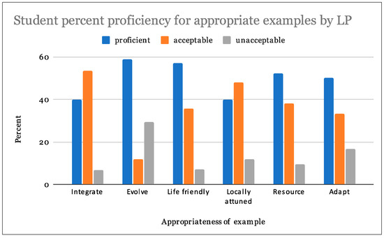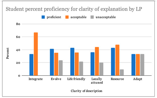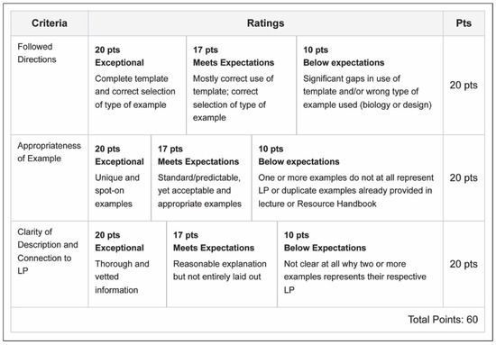 The authors identified pedagogical principles to create a common rubric (Figure 6). Student work was collected, anonymized, randomized, and shared in compliance with Institutional Review Board (IRB) approval and/or student consent for publication. Student assignments were scored by one external assessor using the common rubric. Criteria included following directions, appropriateness of LP examples, and clarity of description and connection to LP. Scores and reviewer comments were recorded in Google Sheets and exported to Microsoft Excel. Percentages of student work scoring proficient, acceptable, or unclear were calculated. Summary bar graphs and single factor analysis of variance (ANOVA) statistics were completed in Microsoft Excel. To test if any LP was more or less challenging for students than any other LP, single factor analysis of variance (ANOVA) statistical analyses were conducted. The authors tested for the effect of LP on student rubric scores. The null hypotheses tested were that there were no significant differences between the student rubric scores for following directions, providing suitable biological and human design examples, and clearly explaining their LP examples for each of the six main LP categories.