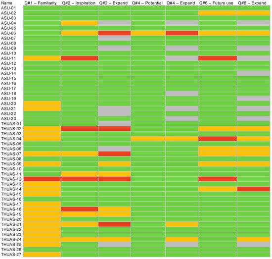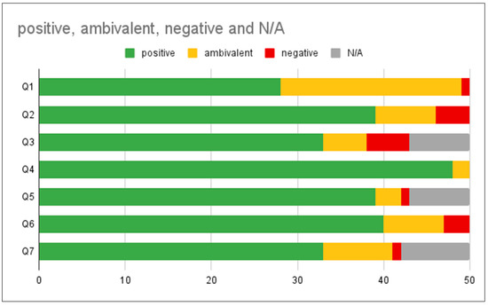 The THUAS and ASU exit survey responses (n = 50) indicate that every student made positive comments overall (Figure 10 and Figure 11). A total of 26 students made ambivalent comments and 9 students made negative comments in the survey free response questions (Q3, 5, 7) (Figure 10).