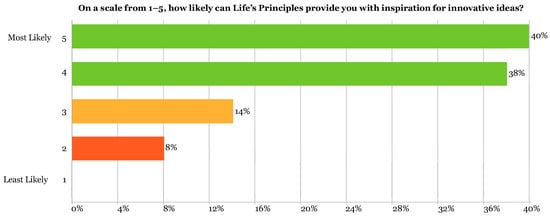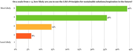 The survey confirmed that the assignment helped the students get introduced to the LPs. In addition, almost all students felt there was great potential in the LPs and nature itself for innovation and sustainability but were unsure how to apply them. It is clear that they understood enough from this assignment about the LPs to know that they could be used as inspiration (Figure 13), where 80% of students selected 4 or 5, selecting “positive” to the question of innovation potential. Conducting a future study on the impact the LPs had on their design decisions can be done with future cohorts to determine how this impacts the innovation and sustainability of their design solutions.