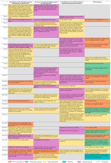 Most of the ambivalent or negative student exit survey responses were comments that described the difficulty of remembering the LPs or indicated that students did not yet see how the LPs could be applied to the design process. One of the challenges mentioned by the students was the need to find ways to memorize the LPs in order to improve confidence in working with them. Student exit survey responses indicated some challenges with understanding the complexity behind the system that nature operates within. A few also wondered how the LPs can be applied in the design process. One factor to consider is that the context changes for each design problem and thus memorizing the LP might not be a worthwhile undertaking, but rather the application of and an evaluation concerning this change would yield greater impact [7].