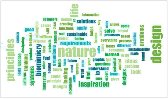 A word cloud (Figure 15) of the answers to the open-ended questions revealed that the word “Nature” was 1st, “Design” 2nd, “Biomimicry” 3rd, and “Inspiration” was ranked 4th place. The words “Life” and “Principles” were eliminated from this ranking because they mention the name of the assignment itself.
