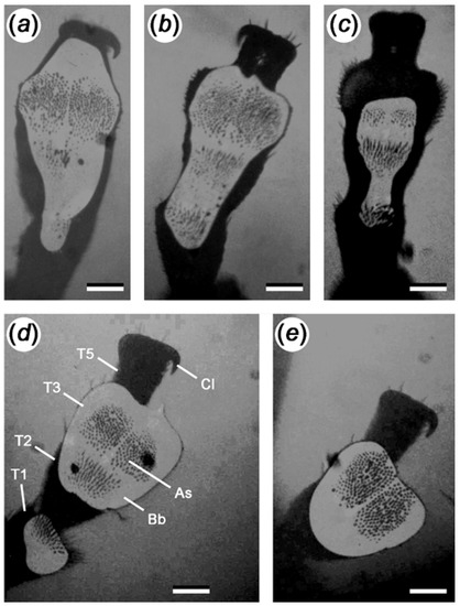 - Stork, N.E. A scanning electron microscope study of tarsal adhesive setae in the Coleoptera. Zool. J. Linn. Soc. 1980, 68, 173–306. [Google Scholar] [CrossRef]