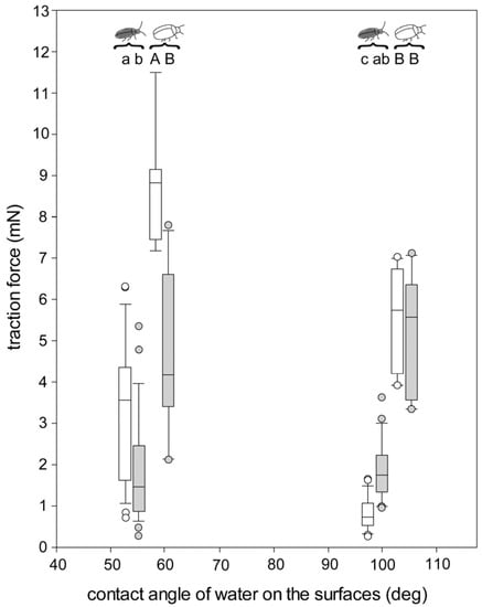 - Grohmann, C.; Blankenstein, A.; Koops, S.; Gorb, S.N. Attachment of Galerucella nymphaeae (Coleoptera, Chrysomelidae) to surfaces with different surface energy. J. Exp. Biol. 2014, 217, 4213–4220. [Google Scholar] [CrossRef]