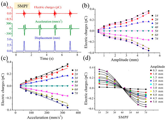 (a) The displacement and linear acceleration of the shell, as well as the output charges of SMPF1#. (b) The relation between the output charges of the seven SMPF sensors and the displacement amplitude of the shell. (c) The relation between the seven SMPF output charges and the shell linear acceleration. (d) The output charges of the seven SMPF sensors at different amplitudes of impact oscillation.