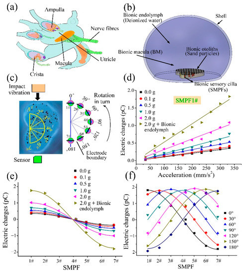 In the human body, there are many otoliths on the otolith membrane of the utricle. The otoliths, which are mainly composed of protein and calcium carbonate, exhibit a higher density than that of surrounding tissue. Thus, the effect of otoliths on the perception of the utricle should not be ignored. Therefore, in this part, imitating the structure of the human utricle (as shown in Figure 5a), sand particles with different masses were embedded on the BM surface to fabricate a bionic macula with sand (BMS), which was installed at the bottom of the utricle shell, as shown in Figure 5c. Deionized water was injected into the shell to fabricate a bionic utricle (BU), as shown in Figure 5b. The BMS and BU were successively subjected to impact oscillation in the direction parallel to the straight edge, as shown in Figure 5c. Under impact oscillation, the waveform to the displacement of the shell of the BMS and the BU and the output electric charges of the SMPF sensors were similar to that of the BM shown in Figure 5d, but their amplitudes were significantly larger than that of the BM. The amplitude of the SMPF1# output charges with different impact accelerations is shown in Figure 5d. The amplitude of the output charges increases with increasing sand mass in the BMS under the same acceleration and is further improved in the BU. The amplitude of the output charges of SMPF 1# is linear with acceleration, which is similar to the experimental results of the BM in Figure 3f. However, the fitting line slope in Figure 5d is significantly larger than that in Figure 3f, which indicates that the sensitivity of the BMS and BU is larger than that of the BM. The BMS and the BU were then subjected to impact oscillation with the same amplitude, and the result is shown in Figure 5e. The amplitudes of the output charges of the SMPFs are distributed according to a cosine curve, which is similar to the result of the BM shown in Figure 3g. The filled endolymph increased the quantity of the output charges. This may be due to fluid inertia, which could help to increase the deformation of the SMPF sensor. Finally, as shown in Figure 3c, the BU around the striola arc was rotated so that the electrode boundary of each SMPF in it was successively perpendicular to the impact oscillation direction, and a diagram of this experiment is shown in Figure 4c. The results shown in Figure 5f indicate that in a single impact oscillation cycle, the amplitude of the output charges of the special SMPF, whose surface electrode boundary was perpendicular to the impact direction, was larger than those of the other SMPFs, and the amplitudes of the output charges of each SMPF at different positions exhibited a cosine distribution. Based on these experimental results, it can be speculated that in the human utricle, under head acceleration, otoliths could increase macular deformation due to their higher density, as could the endolymph, which can act as fluid inertia on the otolith membrane, which is consistent with that by Buskirk et al. [31]. Thus, the existence of otoliths and the endolymph can increase the neural signals of sensory cells and improve the ability of the utricle to perceive head accelerations. Most likely, the human brain determines the direction of the head linear acceleration by the location of the sensory cells along the striola that output the maximum neural signal and determines the magnitude of the head linear acceleration by the maximum neural signal.
