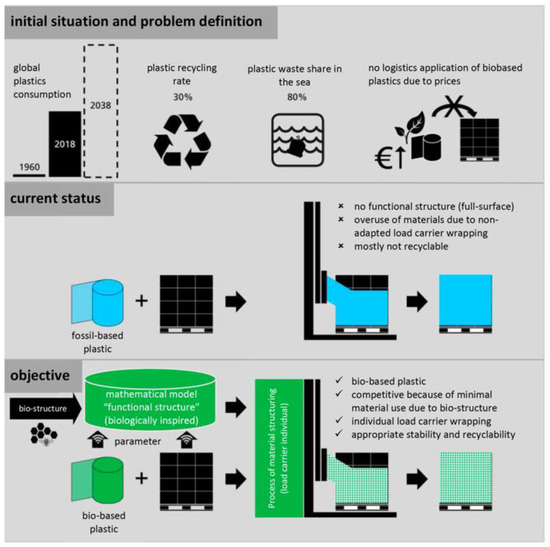 The Research, Technology and Innovation Initiative “Production of the Future” of the Austrian Federal Ministry for Climate Action, Environment, Energy, Mobility, Innovation and Technology promotes the development of Austrian manufacturing research by focusing on cooperation between industry and science. Global plastics consumption is expected to double within the next 20 years. Around 25.8 million tons of plastic waste are produced annually in Europe, while the recycling rate is stagnating at around 30%. Packaging waste, including stretch wrap for pallet packaging, accounts for 59% of all plastic waste produced. Stretch film consumption is expected to increase even more in the future. One attempt to address this problem is the development of more efficient, bio-based and recyclable stretch foil [25] (Figure 3). The objective of such a stretch foil is to reduce the use of stretch wrap based on fossil raw materials for packaging and securing of load carriers by 30% until 2025 compared to 2016. Anticipated project results related to biomimetics are a demonstrator-like prototype of a bio-based, recyclable and biomimetically functionally structured stretch wrap, proof of function in a laboratory environment as well as a mathematical model to develop and optimize a functional and biomimetic structuring of the stretch wrap by means of simulation.