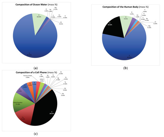The elemental compositions of ocean water, the human body and a cell phone. The elemental composition of ocean water (a) is similar to the elemental composition of the human body (b) and very different from the composition of current engineering devices such as a cell phone (c). Novel biomimetic processes might in the future shift the elemental composition of technical devices towards these of organisms, reducing the need for scarce resources.
