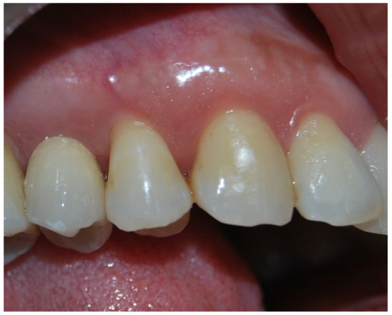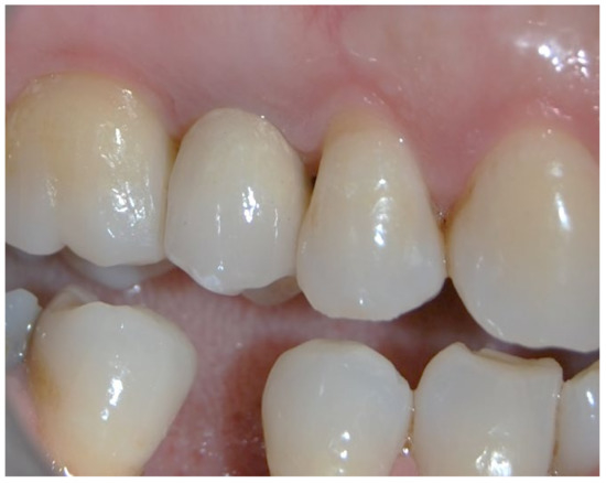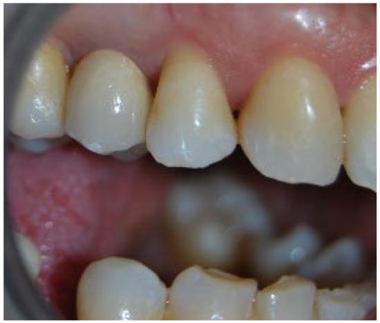 No pathological symptoms were reported by the patient. As shown in clinical photographs (Figure 1, Figure 2 and Figure 3), over the years, the peri-implant tissues have adapted perfectly and remain clinically healthy. Probing pocket depth (PPD) was within the normal range of values (2.5 mm), bleeding on probing (BOP) was not present, there was no sign of gingival recession, no increased mobility, and excellent dimensional stability was highlighted. No signs of bone resorption (0 mm) were evident in radiographs (Figure 4, Figure 5 and Figure 6), considering the distance between the base of the bone crest and the implant shoulder as a reference.