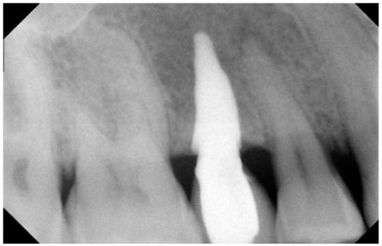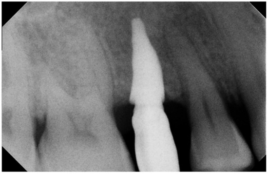 Ten years ago, with the DLMS technique, a root analogue implant (RAI) in Ti-6Al-4v (given the excellent properties of the material) [14] was produced from three-dimensional models developed through the 3D processing of radiographic images, obtained through CT, of the future post-extraction alveolus [15]. This implant was positioned inside the post-extraction socket, kept intact through an avulsion that was as atraumatic and conservative as possible. The selected patient was a healthy 50-year-old female with a fracture of a maxillary second premolar. The patient’s informed consent was verbally obtained for them to take part in the study. The patient was a woman in good health, not suffering from systemic pathologies, not a smoker, with an average lifestyle. No pathological symptoms of the custom-made implant were declared by the patient over the 10 years, and instead the patient considers the treatment very satisfactory, both from a functional and an aesthetic point of view. Excellent primary stability was achieved, thanks to the perfect correspondence between the walls of the alveolus and the shape given to the custom-made implant, as evaluated by percussion and palpation. A metal-free capsule would not have adhered adequately to the custom-made implant, so we opted for a metal-ceramic restoration. Cementation was carried out with GC Fuji I, a highly effective glass ionomer cement. At the subsequent and numerous follow-ups, the outcome of the procedure was clinically and radiographically assessed and a good adaptation of the peri-implant tissues and excellent osseointegration without any signs or pathological symptoms and without any bone resorption was highlighted.