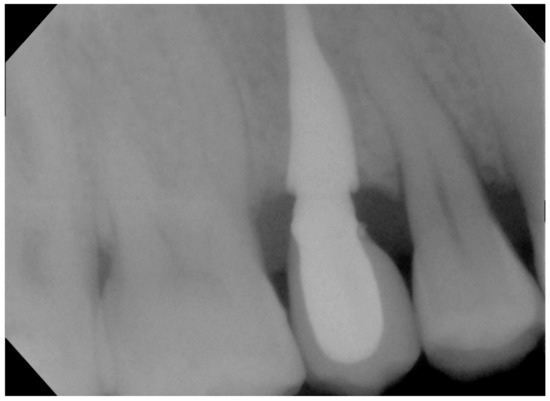 Five-year Rx follow-up. Rx check 5 years after implantation: the prosthetic crown was provisionally cemented to evaluate the clinical course over time (e.g., any infiltrations, etc.), the Rx image at the 5th year was captured after removing the crown to carry out the routine check established in the therapeutic plan, and so it was not present.