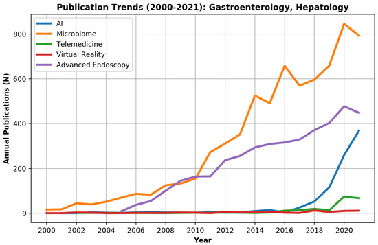 While microbiome- and advanced endoscopy-related publications started to rise in the gastroenterology and hepatology literature during 2000–2008, most digital technology innovation-related publications (AI, VR, telemedicine) were written in the last decade. Telemedicine literature started to rise only in the last two years.
