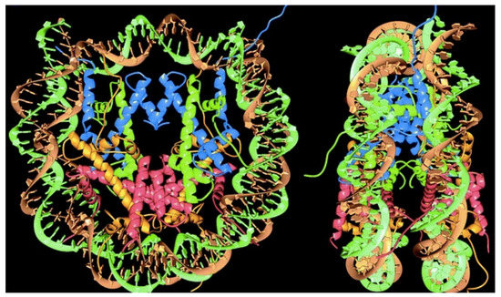 After crystallites of nucleosomes, the core particles of chromatin, were obtained, X-ray diffraction revealed their crystal structure at 2.8 angstroms resolution, a major achievement in 1997 [84]. Figure 2 shows the organization in the nucleosome particle; 146 base pairs of DNA helix surround the histones, representing a way of compacting long DNA chains of the chromatin in eukaryotes; linear DNA compaction thereby occurs by a factor of 30–40 [84]. The nucleosomes further associate into higher-order assemblies linked by the linker histone H1 so that DNA bends and forms high ordered helixes shaped by the histones [85]. The nucleosome is responsible for packaging DNA within the nucleus, largely determining DNA accessibility.