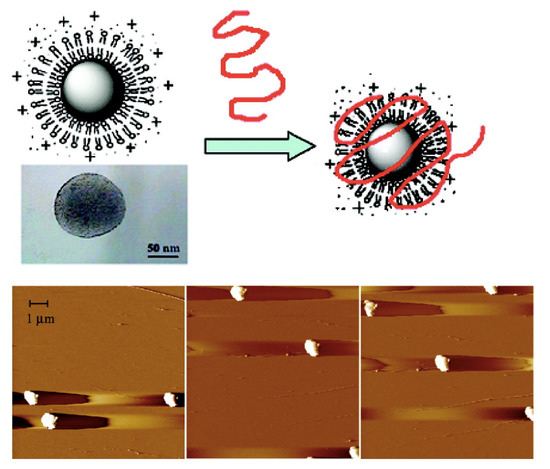 Scheme and AFM micrographs for PSS/DODAB/T2-DNA dispersions at charge neutralization. They display nucleosome-mimetic micrometric assemblies. One should notice some isolated PSS/DODAB nanoparticles and the long T2 DNA chain on the top right corner of the AFM micrograph on the left. Reproduced with permission from reference [36]. Copyright 2008. American Chemical Society.
