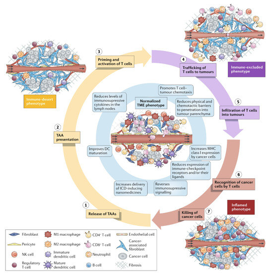 Cancer immunity evolves in two steps: the preparatory and the effector ones [89]. The preparatory step takes place in the LN with release and presentation of cancer antigens for priming and activating T cells. In the next step, T cells reach the tumor mass, trying to recognize and kill the cancer cells in the tumor. However, the tumor tissue and microenvironment can be immunosuppressive due to low immunogenicity of tumor cells, presence of immunosuppressive cytokines, and biological barriers hampering chemotherapeutic agents and immunotherapies to reach the tumor cells [90,91]. Therefore, nanotechnology is needed for surmounting these key biological barriers and effectively deliver chemo- and immune-therapeutic agents and vaccines to their sites of action; sensitive antigens easily degradable in the physiological medium can be protected using nanotechnologies able to increase their half-lives, minimize systemic toxicity, and promote their delivery to APCs in the LN [91]. Nanostructures such as NPs [5,17,43,92], bilayer fragments (BF) [4,12], or peptide supramolecular assemblies [93] become drained directly to the LNs, performing well in the preparatory step [89]. In the effector step, activated T cells should infiltrate the tumor, and stable, long-circulating, and targeted nanostructures could help T cells infiltration improving the outcomes of immunotherapies, which may give a low response rate due to the T-cell poor infiltration in the tumor tissue. Despite the approval of nanomedicines for cancer treatment, the low observed survival was possibly due to abnormal phenotypes of the tumor microenvironment (TME); nanostructures should incorporate anticancer drugs, drugs for improving tumor perfusion, and others to return TME to normality [94]. The extracellular matrix (ECM) produced by cancer associated fibroblasts (CAF) supports cancer cells expressing α-smooth muscle actin and fibroblast activation protein (FAP), both upregulating the expression of other functional cell surface proteins like platelet-derived growth factor receptor β and the insulin-like growth factor receptor II; activated fibroblasts could benefit from delivery of nanoparticles carrying drugs, especially in liver cancer to downregulate growth factors [95]. Figure 4 reproduced from reference [94] illustrates the tasks ahead for nanomedicines: they should also enable normalization of abnormal TME phenotypes, such as the one restricting penetration of cells for immunotherapy (in purple) and the one with inflammatory character (in red); the normal TME appears centralized in blue. The defective vasculature in cancer tissue can not only reduce oxygen supply, but also hampers the penetration of anti-cancer cellular immunity; drugs and normalizers of the vasculature and drugs to prevent the production of dense extracellular matrixes by cancer associated fibroblasts would possibly normalize the TME by improving perfusion, oxygen supply and drug delivery of cytotoxic and anti-inflammatory chemotherapeutics. Importantly, responses to immunotherapy increased when TME normalization approaches were applied [94].