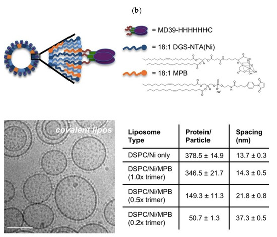 (a) Compared densities of spike proteins in papilloma virus (PV) and HIV able to elicit neutralizing antibodies (in blue). Reproduced from [96]. (b) Increasing the density of HIV antigens on liposomes. The HIV antigens were the MD39 trimmer covalently linked to the liposomes. On the cryo-electron microscopy micrograph, liposomes display the trimmers in a regular manner (bar corresponds to 100 nm); on the table, trimmer densities and spacing in between them depends on coupling strategy and trimmer concentration used for coupling [97].