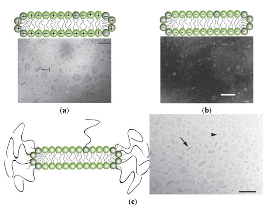 Schemes for cross sections of lipid bilayer fragments or disks and their respective micrographs. On (a), dioctadecyldimethylammonium bromide bilayer fragments or disks seen edge on 1 or face on 2 from cryo-transmission electron microscopy; bar is 100 nm. Adapted with permission from [20]. Copyright 1995 American Chemical Society. On (b), sodium dihexadecylphosphate bilayer fragments or disks seen after negative staining by transmission electron microscopy: scale bar is 100 nm. Adapted with permission from [109]. Copyright 1991 American Chemical Society. On (c), composition of phospholipid, cholesterol, and ceramide conjugated to poly (ethylene glycol) (35:40:25 mol%) seen edge on (arrow) or face on (arrow head) by cryo-TEM; scale bar is 100 nm. Reprinted from [110] with permission from Elsevier, Copyright 2011.