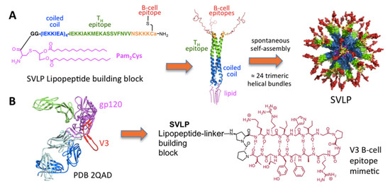 (A) Chemical structure and self-assembly of lipopeptides with epitopes to stimulate B cells (orange) and T cells (green) yielding synthetic virus like particles (SVLP). (B) SVLP aiming at eliciting antibodies against HIV. Reproduced from reference [137] with permission from American Chemical Society Copyright 2017.