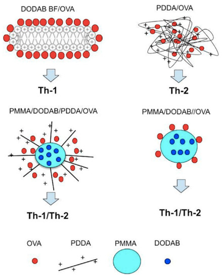 In our group we have been developing biomimetic nanoparticles for drug and vaccine delivery over the last 30 years [15,38,68,141,142,143,144,145]. Some review articles discussed the major role of novel cationic nanostructures based on polymers, lipids, and/or surfactants on efficient delivery of antigens to the immune system [3,4,12,69,146]. More recently, cationic nanoparticles based on biocompatible polymer PMMA [5,23,24,26,46,147] have also been developed besides the lipid nanodisks [16,17,18] and the supported bilayers [22,43,44]. In order to compare the immune responses elicited by the different cationic nanostructures first described in our laboratory while carrying ovalbumin (OVA), we recently made a scheme relating the nanostructure with the obtained immune response [46]. Figure 9 schematically shows a cross section of a DODAB bilayer fragment (DODAB BF) carrying OVA and inducing Th-1 response in mice [18], NPs of PDDA/OVA eliciting a Th-2 response (the hydrophilic PDDA cationic polymer combined with oppositely charged OVA yielding NPs) [92], NPs of PMMA/DODAB/PDDA/OVA eliciting a Th-1/Th-2 dual immune response [5], and NPs of PMMA/DODAB/OVA also yielding a dual Th-1/Th2 immune response [46]. The comparison between DODAB BF/OVA (Th-I inducer) and PDDA/OVA (Th-2 inducer) suggested that the interaction between DODAB BF and OVA inside the APC was weak and OVA readily desorbed from DODAB BF, reached the cytosol and was presented by MHC-I, whereas the interaction between PDDA and OVA in the APC was much stronger so that OVA could not so easily reach the APC cytosol remaining inside the endosome and being processed for presentation by MHC-II for enhancement of humoral immunity. OVA endosomal escape for Th-1 improved response was also obtained for two other cationic and biocompatible nanoparticles especially designed and synthesized from methylmethacrylate in the presence of DODAB or DODAB and PDDA to impart the cationic character to them; these NPs were mostly constituted of the biocompatible polymer PMMA and were named PMMA/DODAB/PDDA [5,147,148] and PMMA/DODAB NPs [23,26,46]. They could embed DODAB well mixed and distributed in the PMMA polymeric matrix [45] and displayed a core-shell structure when PDDA was also added to their synthesis: PMMA and DODAB in the core and PDDA as shell of PMMA/DODAB/PDDA NPs [5,24,147]. Importantly, macrophages and fibroblasts viability remained unaffected by DODAB and PDDA at the concentrations used in the NPs for testing their adjuvanticity in vivo [5,24,148]. Combined with OVA, NPs/OVA enhanced Th-1 and Th-2 responses [5,46]. Figure 9 displays some schematic cross-sections of four cationic adjuvants tested by our group along some decades; the type of response they induced is also quoted.