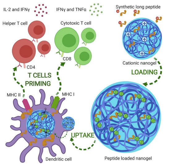 Additionally applicable as therapy for cancer, some interesting nanogels shaped as nanoparticles were obtained from polymerization induced by ultra-violet light of [2-(methacryloyloxy)-ethyl] trimethylammonium chloride and dextran methacrylate in an oil-in-water emulsion; after loading these nanogels with appropriate peptides with or without cysteine moieties, there was an electrostatically driven adsorption or covalent binding of the peptides or cys-peptides to the nanogels, respectively; because the peptides had been synthesized with epitopes that induced maturation of dendritic cells, enhanced responses in terms of cellular immunity and cytokines secretion were also obtained; this was more so when the stimulator of Toll-like receptor poly(I:C) was also added to the formulation [155]. Figure 11 illustrates the cationic nanogels with applications for cancer nanovaccines in action [155].