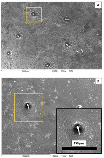 In order to obtain an idea of the microstructure of the external surface of the studied beetles, we took optical (stereoscopical) and scanning electron microscopy images. In Figure 2B,C, we show a section of the elytra of a specimen collected in HMO. Even with no magnification (B), a channel-like pattern can be observed. At 8× (C), this pattern is clearer. It consists of a parallel array of small microchannels. The periodicity of this array is of the order of half a millimeter.