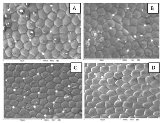 SEM micrographs of the polygon arrays in the background surfaces of E. eschscholtzii individuals. (A,B) Specimens from the HMO collecting site; (C,D) Specimens from KB.
