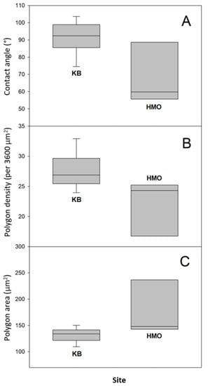 We attempted to relate the morphological surface patterns observed in the samples to the measured apparent contact angles. For this, we determined for each sample the average area per polygon and the average polygon density (per unit area). The number of polygons was estimated in a 60 μm by 60 μm square in the SEM micrographs (Figure S6). The results are presented in Table S2, along with the respective contact angle. We can observe that the samples differ not only in the contact angle value, but also in the polygon area (and thus, density). For instance, the more hydrophilic sample (CA = 52°) displays polygons of a mean area equal to 308.7 µm2, whereas the more hydrophobic sample (CA = 104°) has polygons of a smaller area: 119.2 µm2. In Figure 5, we present boxplots comparing the data for individuals collected in both sampling sites.