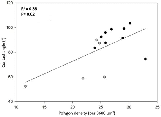 Correlation between contact angle and polygon density per area (3600 µm2): HMO (gray dots) and KB (black dots).