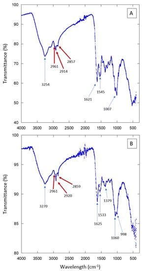 FT-IR scans of elytra from individuals collected in HMO (A) and KB (B).