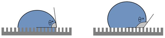 Wenzel-type wetting (left); and Cassie–Baxter-type wetting (right). In the Cassie–Baxter wetting behavior, water droplets are separated from the solid surface due to small air pockets trapped between the grooves.