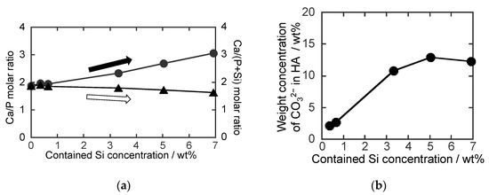 (a) Resultant molar ratios of the (●) Ca to P (Ca/P) and the (▲) Ca to (P + Si) (Ca/(P + Si)) and (b) carbonate weight concentration in the SiHA particles. Here, the contained Si concentrations were 0.35, 0.65, 3.32. 5.03 and 6.92 wt% for 0.8SiHA, 1.5SiHA, 4.0SiHA, 6.0SiHA and 8.0SiHA.