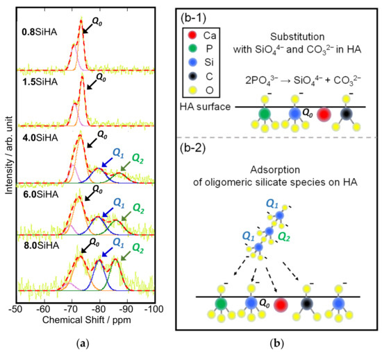 Figure 3a shows the deconvolution curves and fitting results of the spectra of the SiHA particles provided by their Q0~Q2 components. At the lower Si concentration (0.8SiHA and 1.5SiHA), only Q0 peak was observed. However, at the higher Si concentration (4.0SiHA, 6.0SiHA and 8.0SiHA), the Q1 and Q2 peaks appeared. The Q0 peak of the SiO4 tetrahedron corresponded to the stretching Si–O band in the FT–IR spectra of SiHA. The possible inclusion mechanism of the silicates ions into HA structure is shown in Figure 3b. It was suggested that the substitution with SiO44− ions in the HA structures was related to the inclusion of CO32− ions, which was proposed by the reaction mechanism based on the substitution of phosphate ions in Figure 3(b-1). Polymerized silicate chains (e.g., oligomeric silicates) due to Q1 and Q2 peaks appeared at the Si concentration of 3.32 wt%, suggesting that the unsubstituted SiO44− ions began to adsorb on the SiHA with the polymerization and condensation reactions. At the Si concentrations of 5.03 and 6.92 wt%, the intensities of Q1 and Q2 increased, suggesting that the unsubstituted SiO44− ions started to form oligomeric fragments and adsorbed on the SiHA. These results indicated that the oligomeric fragments are larger in the presence of more unsubstituted SiO44− ions as shown in Figure 3(b-2).