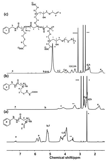 1H NMR spectra of the (a) PANG60 in DMSO-d6, (b) PNAG60-COOH in DMSO-d6 and (c) zwitterion-modified polypeptoid in CD3OD (* indicates DMSO-d6, ** indicates H2O, *** indicates DMF, and **** indicates CD3OD).
