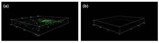 PDMS is one of the most commonly used medical materials because of its inherent biological inertness. When PDMS is exposed to a complex environment, i.e., a foreign body, this can lead to a series of immune rejection reactions. For example, when it comes into contact with blood, proteins and red blood cells present in the blood immediately attach to the PDMS surface, followed by activation of coagulation factors, platelet adhesion, activation, and clustering, ultimately forming a so-called thrombus. As protein adsorption is the first stage of an undesired complication, biomaterials must effectively resist nonspecific protein adsorption. Thus, we used fluorescein isothiocyanate (FITC)-labeled bovine serum albumin (BSA) as a model protein to investigate the antifouling properties of smooth substrates and modified zwitterionic polymer coatings. The pristine and modified PDMS were incubated in 2 mg/mL of FITC-labeled BSA protein at 37 °C for 24 h, and then they were centrifuged at 400 rpm. The fluorescence brightness was observed via confocal laser microscopy (CLSM). Figure 4 shows many bright green fluorescent spots on the surface of the unmodified coating, indicating that a considerable amount of protein adhered to the surface of the coating. On the surface of the zwitterionic polymer coating (Figure 4b), meanwhile, barely any fluorescent spots can be seen, which indicates that next to no protein adhesion took place on the surface of the coating. The resistance of zwitterionic polymer coatings to organic adsorption stems from their super-hydrophilic properties, which allow them to attract a large number of water molecules to form a protective hydration layer, thus increasing the energy required for protein adsorption. Therefore, by inhibiting the adsorption of organic matter on its surface, we can slow down the build-up of biological pollution.