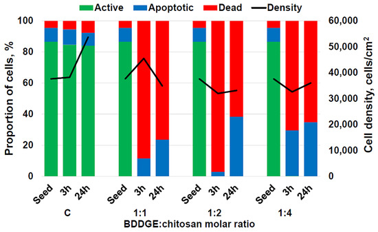 The results of flow cytometrical analysis of control (C) human colon carcinoma cells (HCT 116) and cells cultivated for 3 and 24 h in the presence of BDDGE at concentrations corresponding to a BDDGE:chitosan molar ratio (in 3% polymer solution) of 1:1, 1:2, and 1:4 (see example of calculations in Table S2, Supplementary Information). The cells were stained with H2DCFDA to assess the mitochondrial activity, TO-PRO-3™ to detect apoptotic cells, and DAPI to stain dead cells. The data are presented as a mean of three independent experiments. Standard deviations did not exceed 5%.