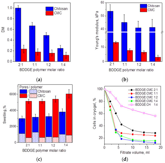 Figure 2 shows the comparative characteristics of chitosan- and CMC-based cryogels. Although the degree of polymer modification (DM) with BDDGE cannot be attributed to cross-linking density due to the possible formation of grafts (structure 4, Scheme 1), it confirms the lower reactivity of CMC in comparison with chitosan. Since the DM of CMC was below 0.25 even at the highest BDDGE:polymer molar ratio and only slightly decreases with a decrease in BDDGE concentration, we have concluded that a high carboxyalkyl substitution of CMC indeed limited the number of reactive functional groups, which could participate in the cross-linking reaction. Chitosan can react with BDDGE via abundant hydroxyl and amino groups (Scheme 1, structures 2 and 3), so the DM values were close to the theoretically expected (Figure 2a). A decrease in crosslinking density resulted in a decrease in Young′s modulus (Figure 2b) and increase in swelling for both series of cryogels (Figure 2c).
