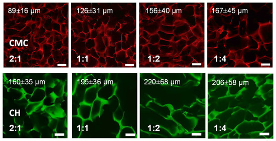Confocal laser scanning microscopy (CLSM) images and average pore sizes of CMC- and chitosan (CH)-based cryogels fabricated at different BDDGE:polymer molar ratios. Scale bar—100 µm.