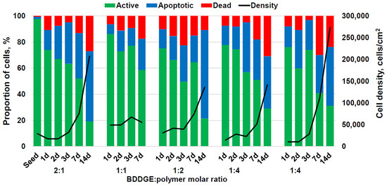The results of flow cytometrical analysis of human colon carcinoma cells (HCT 116) cultivated for 1, 2, 3, 7 and 14 days in CMC cryogels (1–4) and chitosan cryogel (5) cross-linked at various BDDGE:polymer molar ratios. The cells were stained with H2DCFDA to assess the mitochondrial activity, TO-PRO-3™ to detect apoptotic cells, and DAPI to stain dead cells. The data are presented as a mean of three independent experiments. Standard deviations did not exceed 5%.