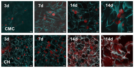 Confocal laser scanning microscopy (CLSM) images of CMC- and chitosan (CH)-based cryogels (BDDGE:polymer ratio of 1:4) with HCT 116 cells after 3, 7, and 14 days of cultivation. Scale bar—100 µm.