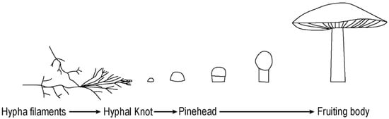 In each experiment the mushroom growth followed a common and well described developmental pathway starting with the vegetative phase (hypha growth), which continued to the reproductive phase (fruiting body formation) (Figure 1) []. Hypha filaments transform to the fertile tissue of a fruiting body under suitable conditions. The organization of hyphae significantly changes while creating fruiting bodies. Normally, the filaments show positive autotropism by growing in an upwards direction; however while forming a fruiting body structure, they start to grow inwards and show negative autotropism []. This is due to hyphae forming a three-dimensional compound complex by interlocking with other hyphae structures, instead of simply forming an unconstrained mesh. The initial development of the fruiting body begins with a hyphal knot, which can be triggered by a disturbance such as an injury, edge encounter or changes in nutrient levels, temperature, or light exposure []. In the formation of Basidiomycota fungi, hyphae form knots by reducing their level of chitin and the knots become mushrooms by expansion and inflation of pre-existing hyphae. Depending on the species’ phototropic requirements, the progress can proceed with the introduction of light that leads to cellular differentiation []. The formation of stipe (stalk), cap (pileus), and gill cells occur during this process, during which the mushroom takes on its characteristic appearance []. The spores are discharged from the surface of gills. Therefore, gills increase their surface area by folding, to allow the production of more spores.