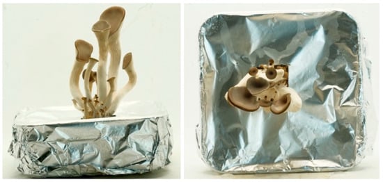 In this set of experiments, the effect of substrate amount on mushroom size was tested. 40 g, 80 g, 120 g and 160 g mycelium and various substrates were mixed in the ratio of 25% of strawbale, 25% of wood shavings, 25% of coffee grounds, and 25% of mushroom spawn, as mentioned before. All mixtures were kept in (10 × 10 × 3 cm) plastic box and covered with aluminum foil with a 4 × 4 cm hole in the middle of one of the widest surfaces, as seen in Figure 3. The aim of guiding the mushroom growth from a single opening was to limit the number of fruiting bodies, thus, to prevent overcrowding, to focus on the size of the mushrooms.