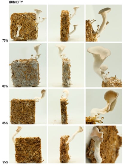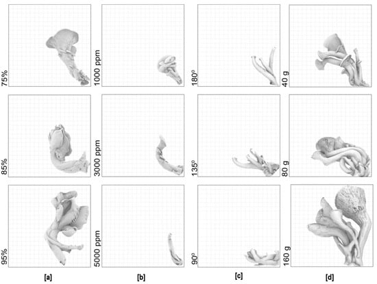The major factors that affect the form of mushrooms depend on the species. Bellettini et al. has conducted experiments which show the key parameters affecting the mushroom morphology of oyster mushrooms: air temperature, light, humidity, CO2 levels, gravity, substrate amount and size []. These factors influence the cap and stalk’s shape, size, and surface finish of oyster mushrooms []. Therefore, in this study humidity, CO2 level, gravitational force and substrate amount are used as variables to test the parametric qualities of mushrooms. Light duration and temperature are kept as constant values since we found across our interaction with fungi that they are more effective in initiating the mushroom formation rather than affecting mushroom morphology. High humidity environments provide favorable conditions for mushrooms to thrive in and bear fruit []. Different sources state that using 90–95% humidity or using 80–85% humidified culture room as well as spraying their fungi three times a day helps to achieve the optimal mushroom yield [,]. Stalk thickness tends to decrease with the decrease in the level of humidity, since there is not enough water for mushroom development [,].