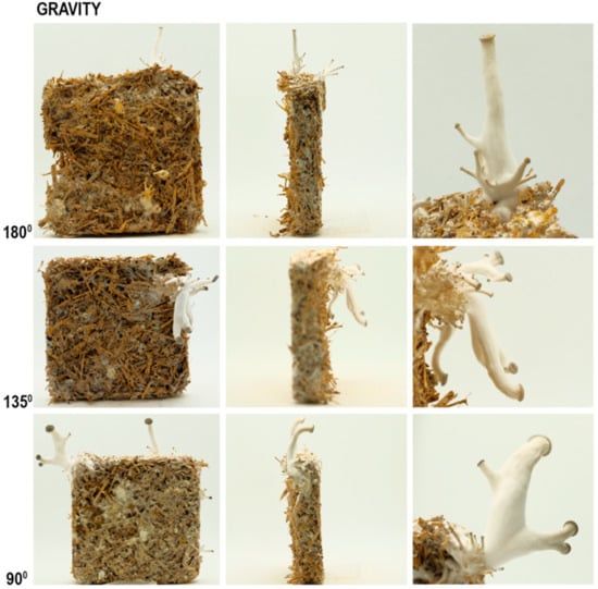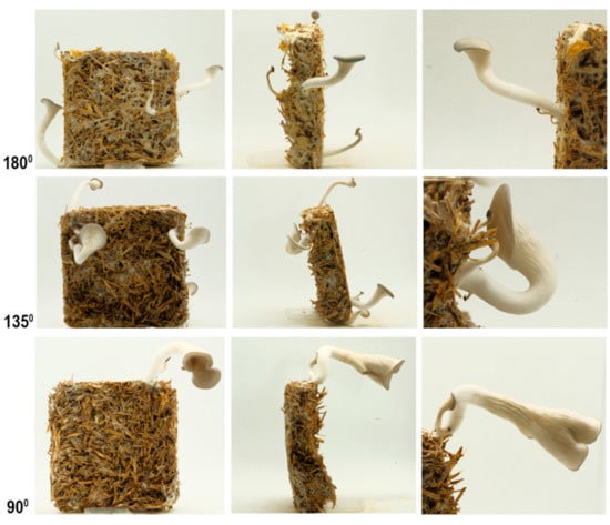 Many mushroom stalks possess negative gravitropism [] as the fruiting bodies grow in the opposite direction of gravity and bending of the stalk occurs at the upper region closest to the cap []. In the literature, the substrate mass has often been studied as it affects the size and number of mushroom blooming because of the impact on nutrient availability.