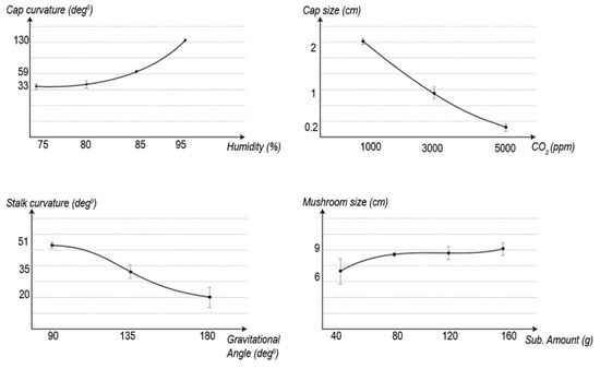 The experiments also demonstrate that fungi exhibit linear parametric properties when a single parameter is changed, at least for the limited parameters and a single family of mushrooms tested here. As shown in Figure 12, each parameter change exhibits a distinct trend, although the high degree of variability exhibited in relation to mushroom size and substrate amount should be noted. More replicates are required in the future to achieve a higher significance of results. In all experiments, further replicates would need to be conducted to provide more significant relationships. Nevertheless, using these parameters, it should be possible to predict the morphology of mushrooms given specific parameters—within the range of values tested by the experiments.