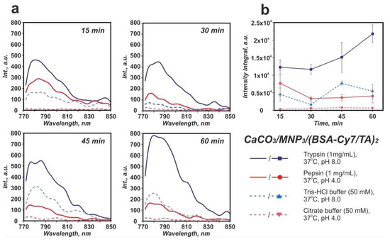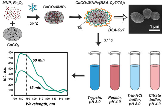 The CaCO3/MNP3/(BSA-Cy7/TA)2 carriers (10 mg) were resuspended in 1 mL of deionized water. To study the enzymatic degradation of the shell, 10 µL of sample suspension were incubated with 190 µL of enzyme solutions at 37 °C under continuous stirring (1000 rpm) for 15, 30, 45, and 60 min. The enzyme solutions were (1) 1 mg/mL of trypsin in 50 mM Tris-HCl buffer (pH 8.0), and (2) 1 mg/mL pepsin in 50 mM citrate buffer (pH 4.0). To find out, if the buffer medium affects the carriers itself, 10 µL of carrier suspension were also incubated with 190 µL of buffer solution (50 mM Tris-HCl buffer, pH 8.0 or 50 mM citrate buffer, pH 4.0) under similar conditions. In all sets of experiments, the incubation was repeated for three times. Upon incubation, the supernatants were separated from the carries by centrifugation (6000 rpm for 1 min) and the fluorescence spectra were measured. The scheme of the experiment is shown in Figure 1.